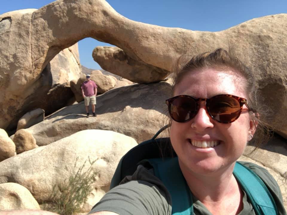 11:30 AM – We continued through the park up the Pinto Basin Road to the Twin Tanks Parking lot. From here we had a 1.4 mile lollipop trail through sandy and rocky terrain to reach Arch Rock. At this point we had only seen a few of the namesake trees, when I was informed that my husband (Josh) would in fact NOT be taking a picture with every single Joshua tree
